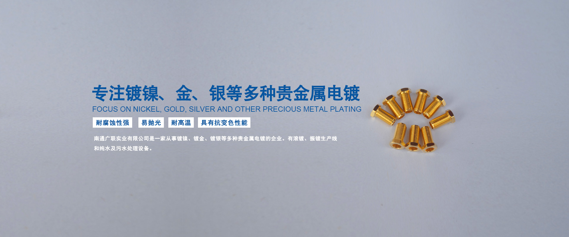 南通廣聯實業(yè)有限公司是一家從事鍍鎳、鍍金、鍍銀等多種貴金屬電鍍的企業(yè)。有滾鍍、振鍍生產線和純水及污水處理設備。